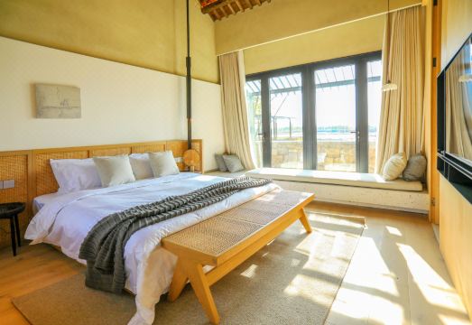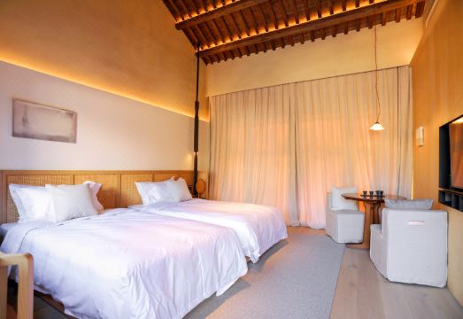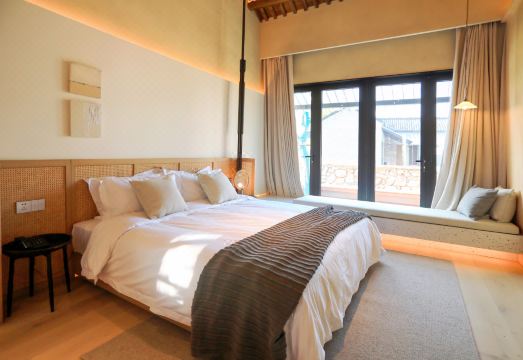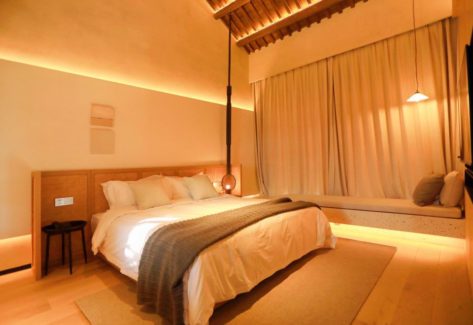 村落书院承载着水乡村落的静谧,壁炉陷入光阴的褶皱,布艺,烛群,干木柴,旧案台,一眼,便能触达自然;餐厅的风光食馔集结着村庄的美好食材,让饮食成为天然的疗养,荷塘,苇荡,秀色,可餐,目睹天光落入夏池;日落茶房中流动着270°的自然,阳光,灵雨,日落,星空,在竹椅几不可闻的嘎吱声中,重返内心的愉悦平和;酒店的客房分散在低密度院落中,竹篱笆梦回旧田园,矮石墙和老木窗勾连岁月悠长,微下沉式的小院有篝火,待归人。
